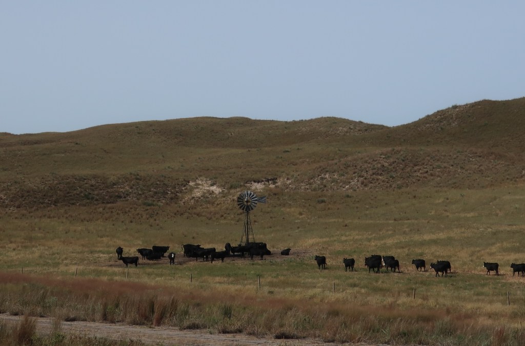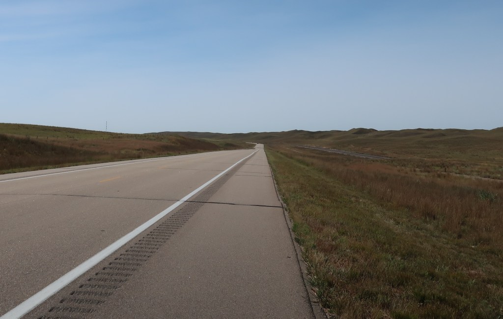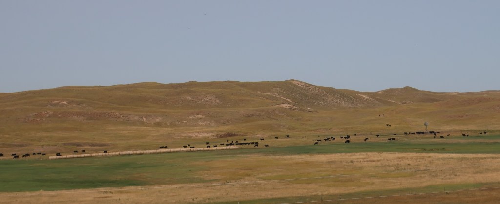 Welcome to Nebraska where the cows outnumber people with 23 million acres of rangeland and pastureland! Started out this morning at 51 degrees but ended the day around 90. Ran up I-24 for 50 some miles to Iowa. Overtook one tractor trailer and caught up to a second one just before our exit. We didn’t see any other vehicles on our side of the interstate that entire stretch! Left the interstate for good at Grand Island Nebraska and came across Highway 2 through the Sandhills.