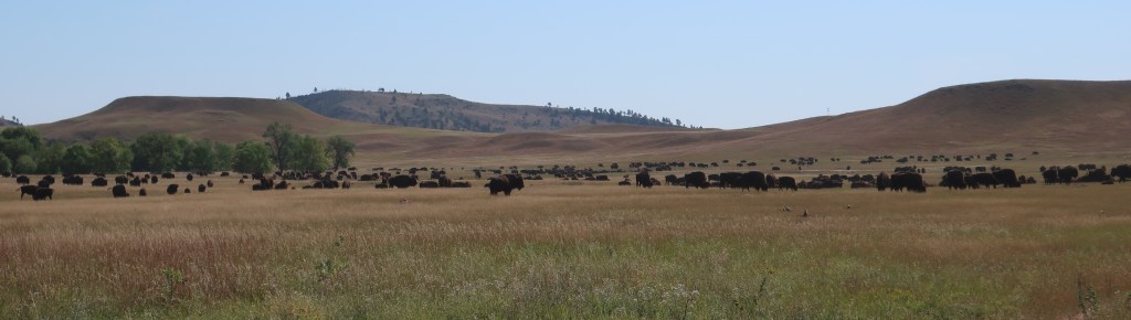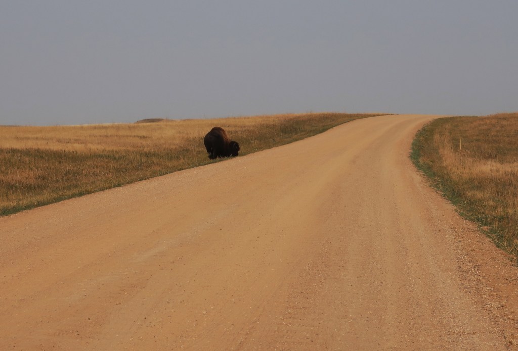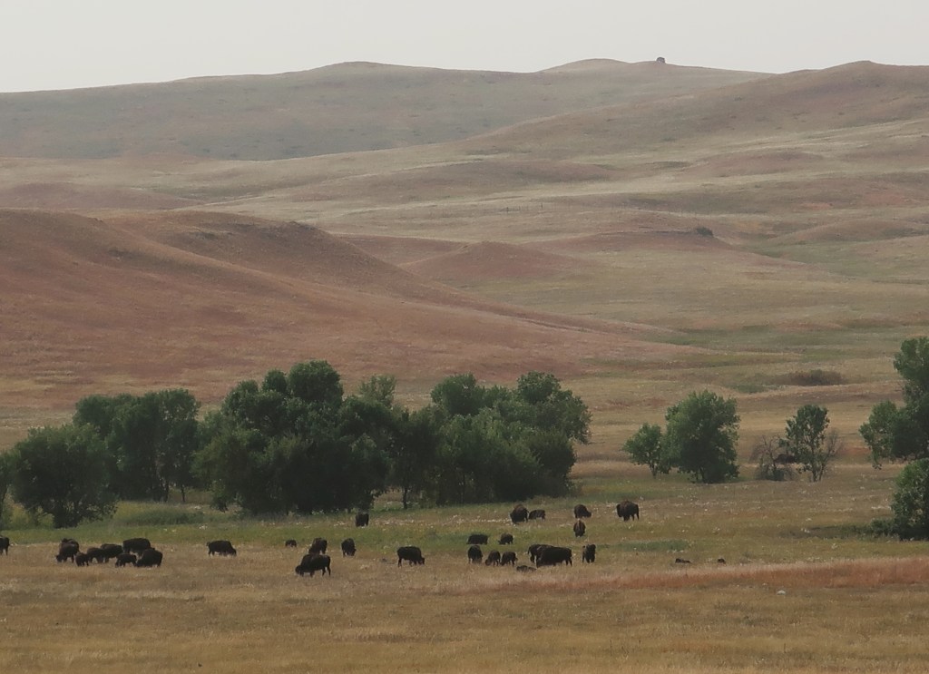 We had one final crossing of Custer State Park leaving the Black Hills. Saw more buffalo, but this time they were off the road. It’s incredible to think that there were tens of millions in North America when European settlers arrived and then hunted to near extinction. Once the railroad made it possible to ship hides back east, buffalo were killed at a rate of 5,000 per day for 2-3 years. Most were skinned and the carcasses left to rot. It decimated the Native American’s way of life.