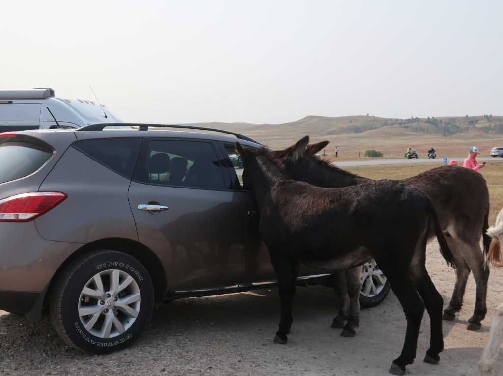 From Needles, we caught the wildlife loop through Custer State Park. Saw one of the buffalo herds, the wild burros (they actually aren’t very wild anymore), and pronghorn antelope. The burros actually we’re poking their heads in people’s cars looking for food. Two little ones were sacked out flat on the ground while people walked around them taking pictures. The buffalo herd was well off the road, but we have encountered lone bulls three times now on roads in the general park.