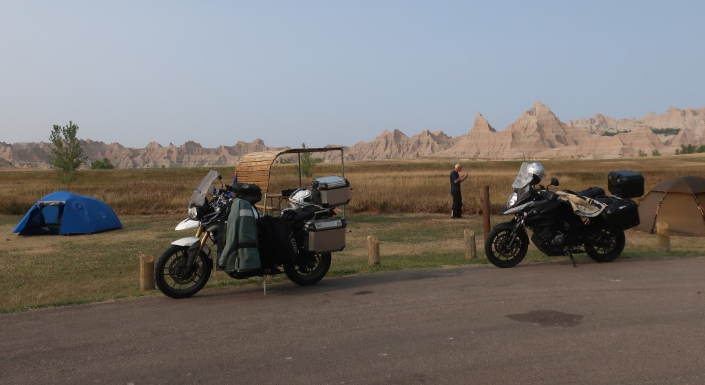 We are in Badlands National Park for the night. Didn’t get much sleep last night as the thunder and lightning made sleeping on the ground in a cloth bag somewhat unsettling. Heavy rains washed out the camp driveway making our departure from Horsethief a bit sketchy, especially for Don and the Battlestar Galactica as he refers to his 700 pound Honda. Don’t worry, he still has the VStrom, just chose the ST for this trip. We ran into road construction a few miles from the Badlands National Park too. The asphalt was gone and it was mostly dirt with a little gravel for a mile or so. Rained all night and was still raining today so it was kind of muddy. Don and the big Honda soldiered through. We are camped at Cedar Pass in the park and the weather is starting to clear a bit.