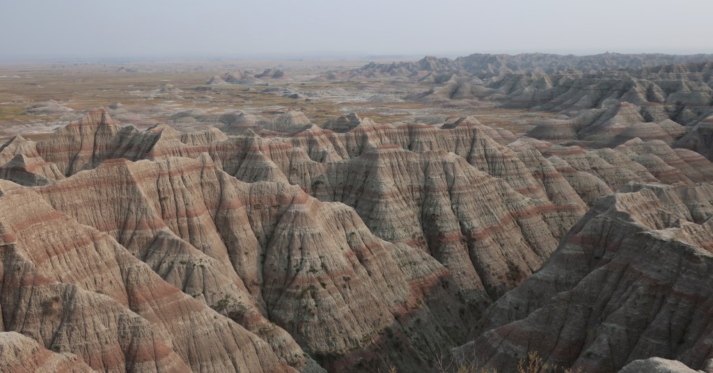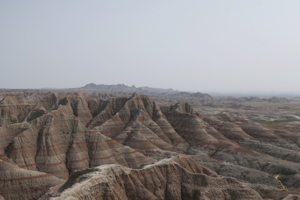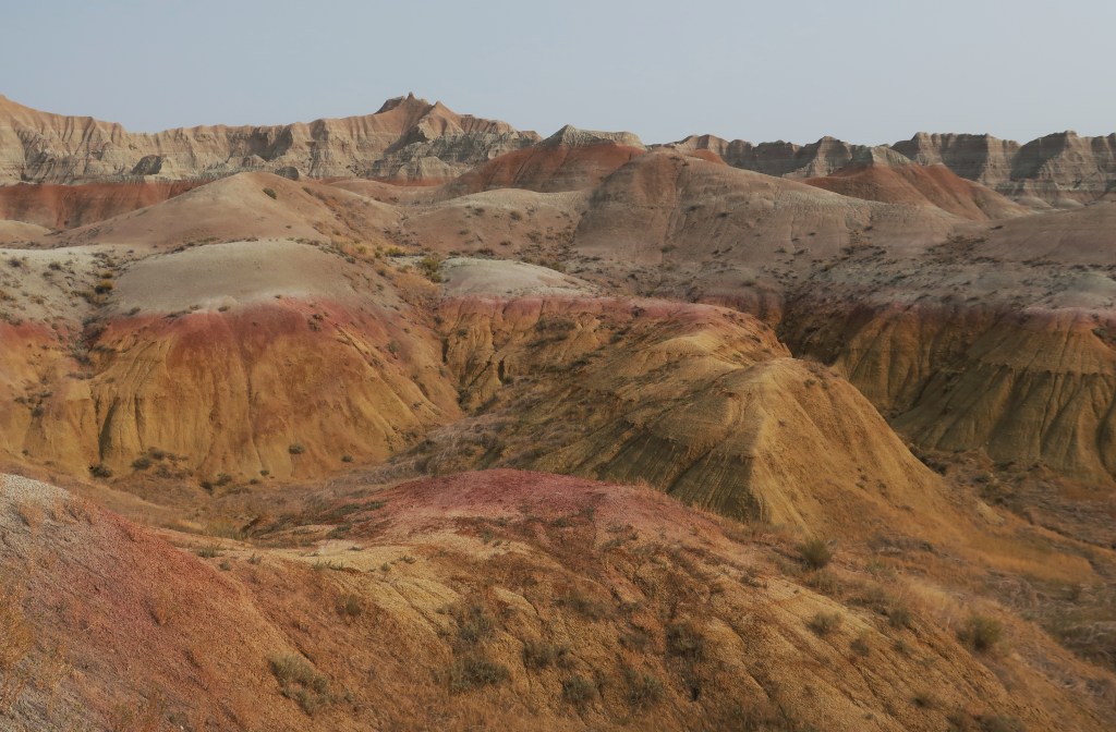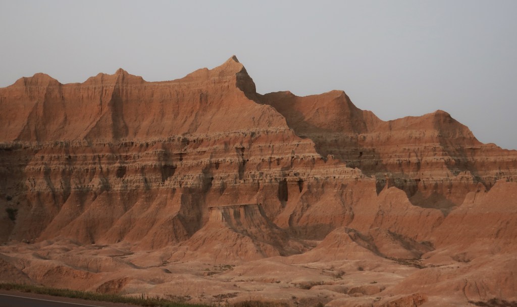 I hate to sound like a broken record, but it’s been another stellar day. I still don’t know how to describe the Badlands….. bizarre, rugged, beautiful, unique, ever-changing, fill dirt with a lot of gravel….. they all apply. It’s a landscape that seems surreal. If you ever visit here, you must spend a full day at least. The Badlands look different from morning, to mid-day, to sunset. And the night sky is amazing, even with the smoke haze.