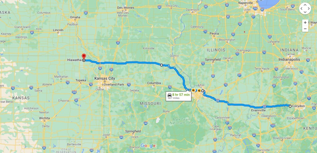 I’ll try to include maps this time unless we scrap the itinerary. It was a long day but pleasant once we got around St Louis and got off the interstate. Still mostly divided 4-lane with high speed limits. Bedded down in Hiawatha Kansas for the night. We’ll see what tomorrow brings.
