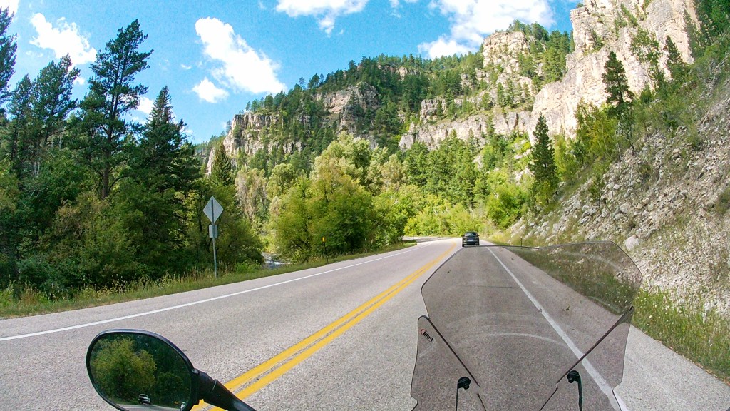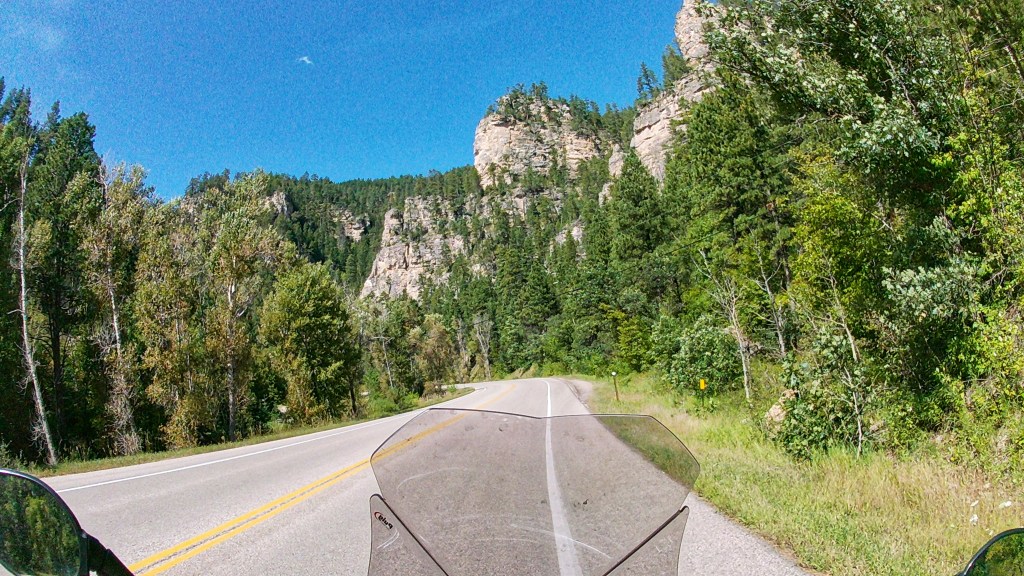 Spearfish Canyon is quite the tourist attraction although Don and I don’t know why. It is pretty but not any more so than all the other roads around here. I’ll try the helmet cam tomorrow in Custer State Park and if I almost hit a bison again, maybe I can get a picture before he gores me.