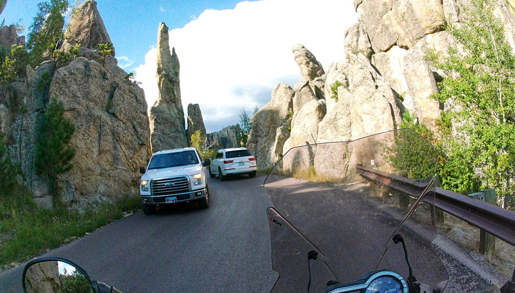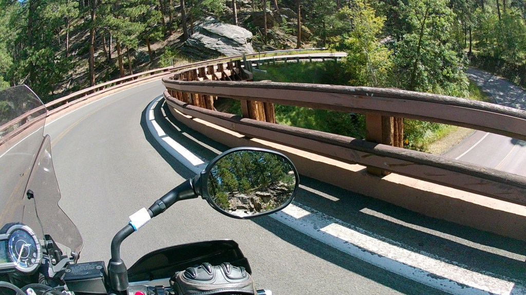 Had a great day of riding and the helmet cam worked well. It is mounted on the chin bar of my helmet with a remote located within reach of my thumb. I did manage to get some good shots of those pigtail bridges on Iron Mountain Road that eluded me last time. The day started with Needles Highway….