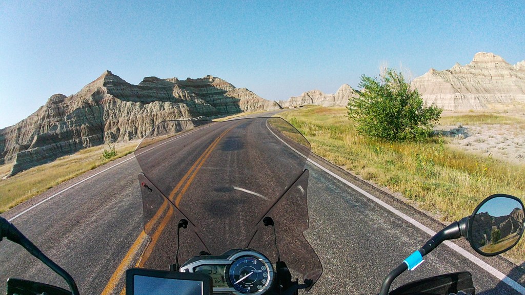 We ran over Iron Mountain Road, another fantastic road and I believe my favorite. It has a nice sinuous flow and a few tunnels of it’s own. Our most recent encounter with a bison bull came on this road. I swooped around a blind curve and was staring at one massive butt in the middle of my lane! Fortunately we had time to stop as I’m sure his wrath would have hurt worse than the initial impact. He gradually meandered off the opposite side and we eased on by. The road leaves the park and heads towards Mount Rushmore. You are looking straight on at the famous heads going through two of the three tunnels. The other thing Iron Mountain Road is famous for is the pigtail bridges. These are basically 360 degree spiral wood trussle bridges to drop the road elevation while disturbing the landscape as little as possible. I couldn’t safely get a picture of one so try Google if you are curious.